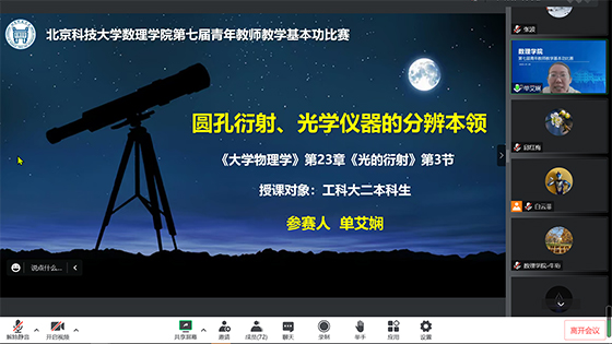 为进一步提高学院青年教师教学能力和水平,搭建青年教师学习交流平台,发掘新一代优秀青年教学骨干,36365线路检测中心欢迎您分工会和教师发展中心联合组织的第七届青年教师教学基本功比赛于2023年1月5日通过线上方式成功举办。学院党委书记牛珩、院长庞晓露,校督导组专家代表,院、系班子成员,院教学委员会成员及北京市教学名师代表等31位专家参加了本次活动并担任教师评委,来自不同专业的8名学生担任学生评委。比赛由学院行政副院长白云菲主持。部分青年教师参加了教学比赛观摩。